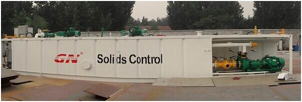 一個40英尺集裝箱大小的泥罐設(shè)計有足夠的空間進行泥漿的回收及儲存,2臺50HP的 GNSB6x5-12型離心泵,其中一臺是用于輸送泥漿到去除泥器,而另一臺用于混漿