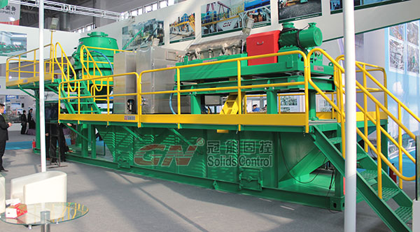 本屆石油展我們推出了一款鉆屑處理系統(tǒng)。該系統(tǒng)包括一個立式巖屑甩干機,一個高速離心機,雙螺桿泵和兩個正壓控制系統(tǒng)。該系統(tǒng)是綜合我們大量客戶的實際要求而設計的標準化鉆屑處理系統(tǒng),可以為客戶處理不同工況下的水基泥漿和油基泥漿。