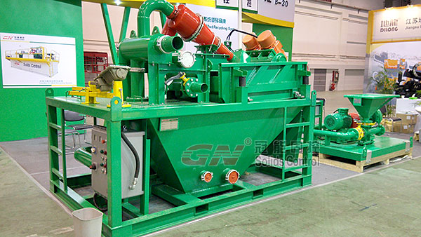 本次展會(huì)主要展出了120m³/h處理量的泥漿回收系統(tǒng)及配套的射流混漿系統(tǒng),主要配置了一臺(tái)GNZY753E-Y1S型篩泥一體機(jī),雙層篩網(wǎng)設(shè)計(jì),面積達(dá)到2.225m³,可分離固相粒度40微米,旋流器采用高質(zhì)量聚氨酯材質(zhì),耐磨,使用壽命長,振動(dòng)電機(jī)采用國際意大利OLI品牌或者美國馬丁品牌,篩箱底框采用不銹鋼材質(zhì),振動(dòng)強(qiáng)度達(dá)到7.1G(可調(diào)),并配有GNSB6×5A(37KW)離心泵為除泥供漿泵,采用機(jī)械密封,使用壽命長并便于維修。整套系統(tǒng)撬裝設(shè)計(jì),移動(dòng)便捷,使用方便。