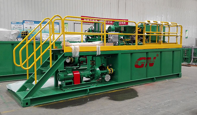 本套系統(tǒng)分為2個(gè)階段的固控處理和一套泥漿配置混合系統(tǒng)。鉆井泥漿初步分離采用的是冠能GNZS752型振動(dòng)篩,200GPM的處理能力、兩片篩網(wǎng)的構(gòu)造用來(lái)處理鉆井泥漿中的大顆粒的固體。振動(dòng)篩處理后的液體通過(guò)離心泵輸送給迷你型的沉降離心機(jī)GNLW223進(jìn)一步處理,可達(dá)3800RPM的轉(zhuǎn)速,分離的固體顆粒可達(dá)到2個(gè)微米。